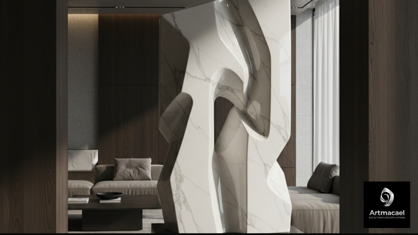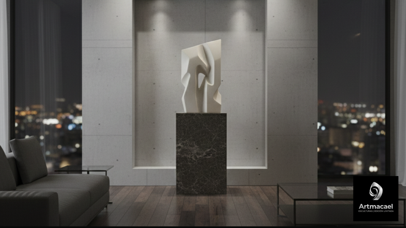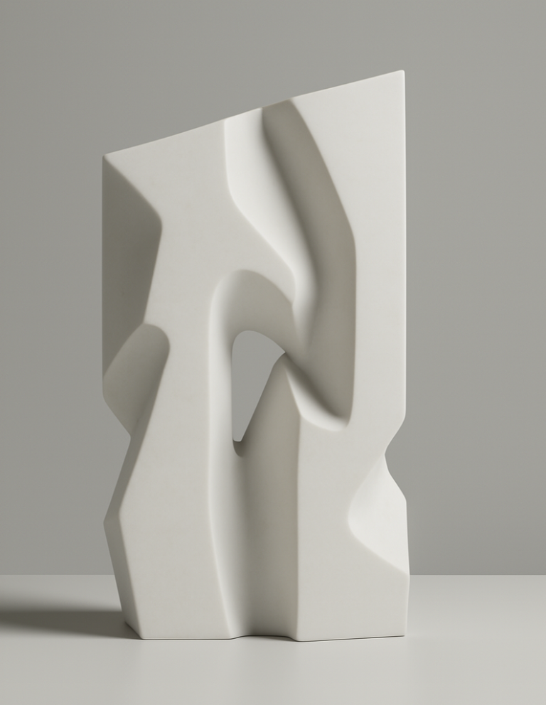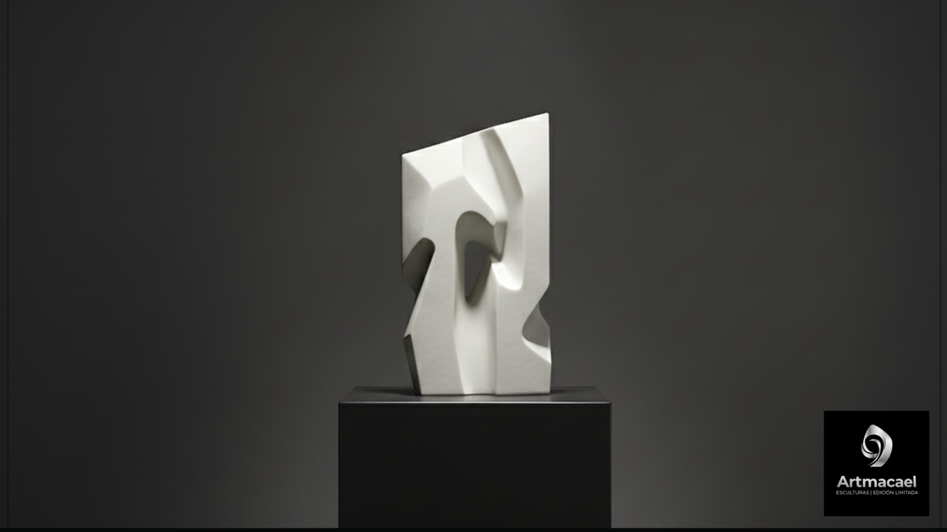 Una forma geométrica y abstracta que revela la belleza de la angulosidad y el movimiento. Sus planos se cruzan en una danza audaz, capturando un instante de tensión y dinamismo. Las superficies pulidas reflejan la luz de forma inesperada, creando una interacción fascinante entre la solidez de la piedra y la fluidez de sus líneas.
